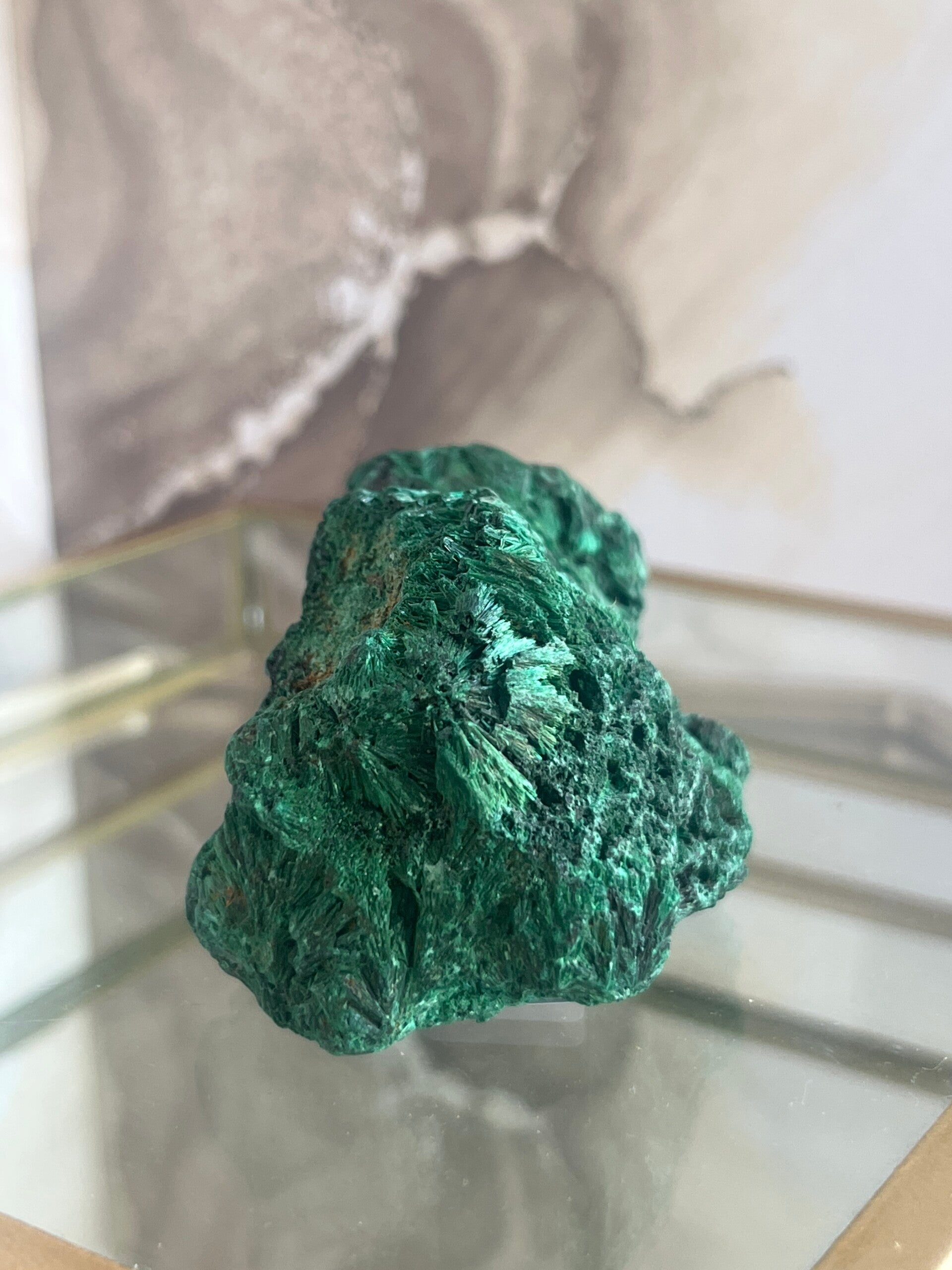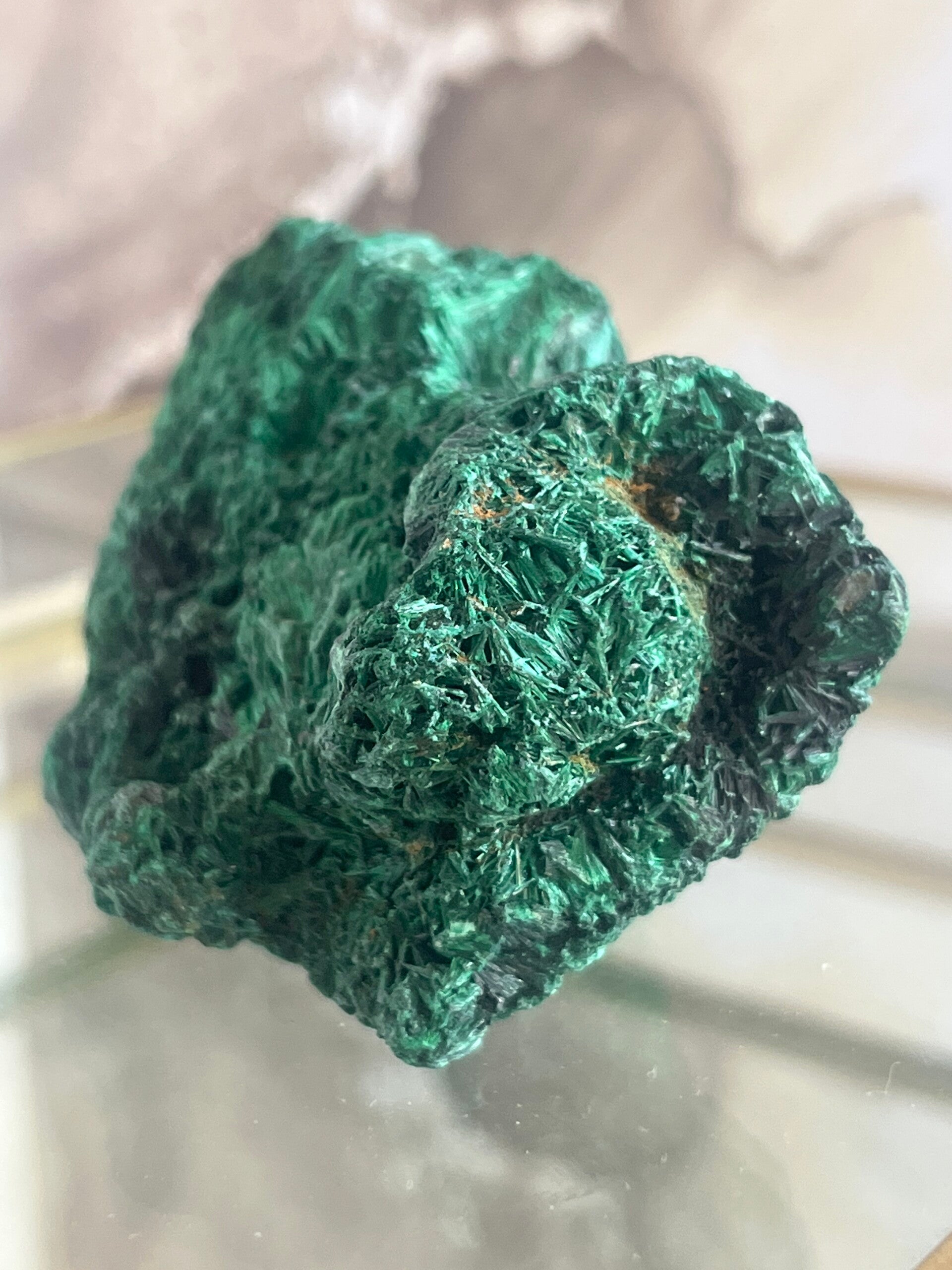 Deze betoverende malachiet, met zijn diep smaragdgroene, fluweelachtige structuur, is een ware blikvanger. Velvet malachiet staat bekend als steen van transformatie en bescherming: hij helpt negatieve energie omzetten in groei, kracht en innerlijke rust.