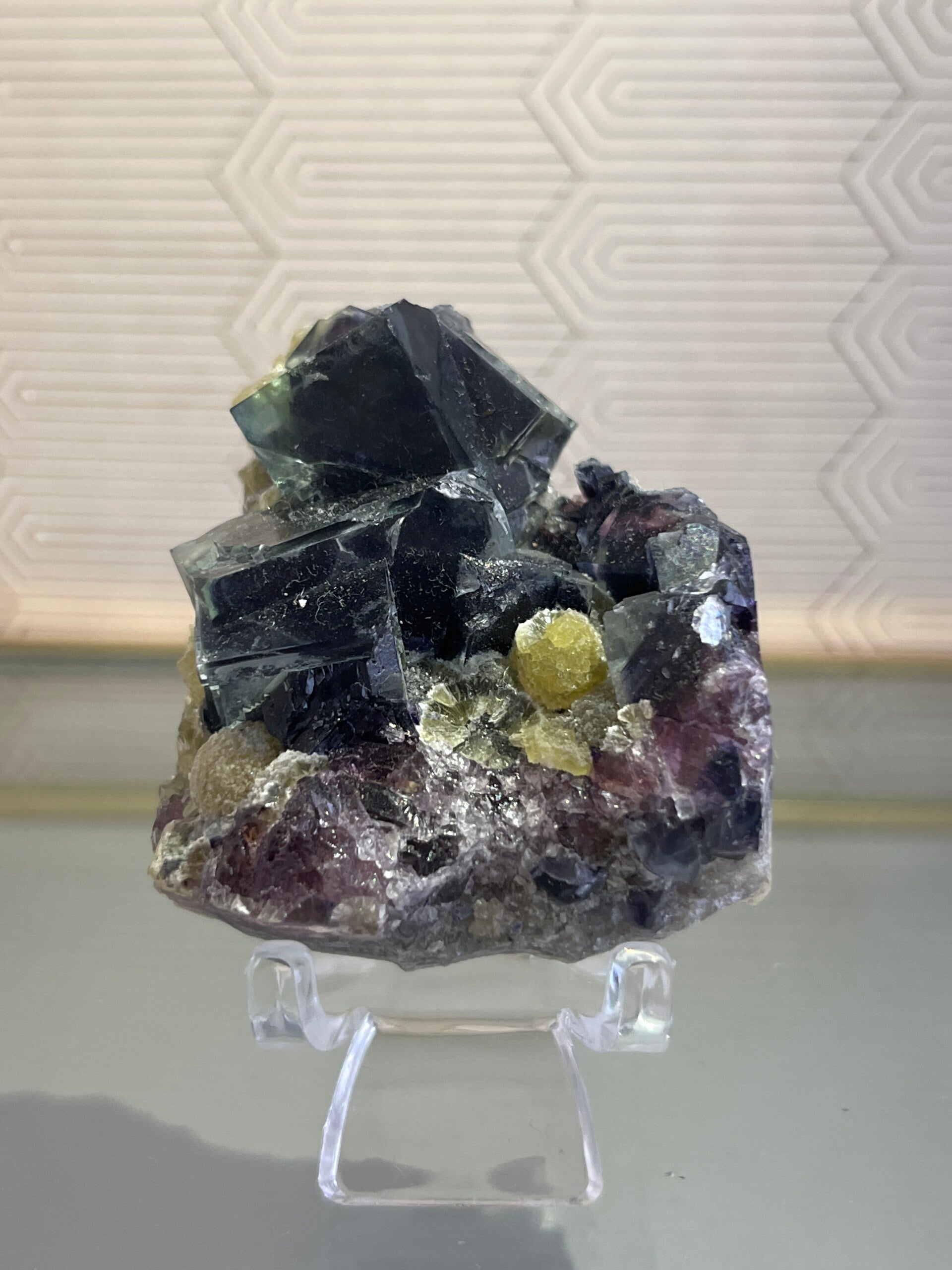 Dit bijzondere exemplaar combineert heldere, krachtige kubussen in blauwgroen met zachte gele insluitsels, waardoor het visueel én energetisch een parel is.