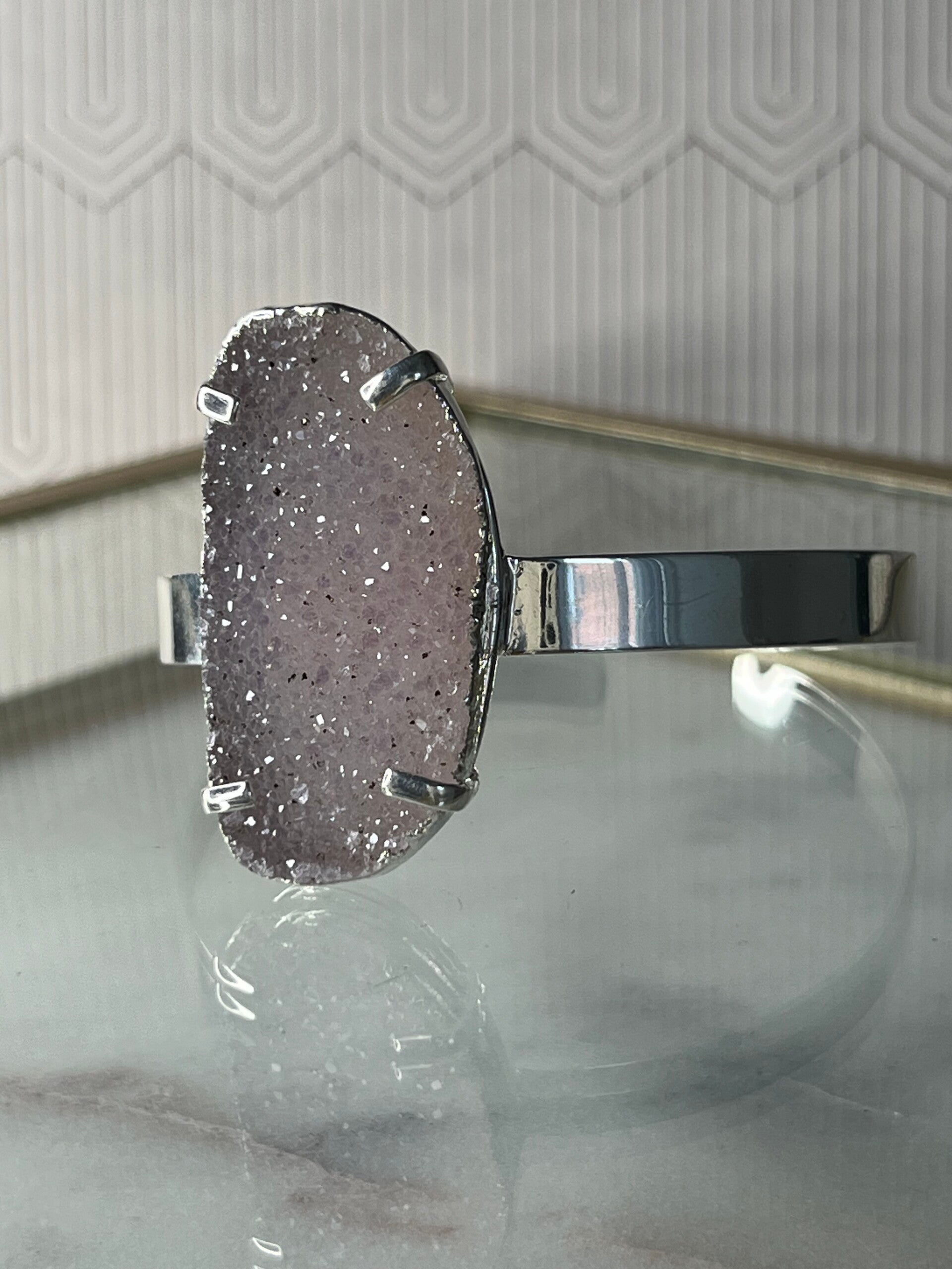 De natuurlijke regenboog amethist is gezet in een verstelbare, zilverkleurige manchet – perfect voor elke polsmaat.