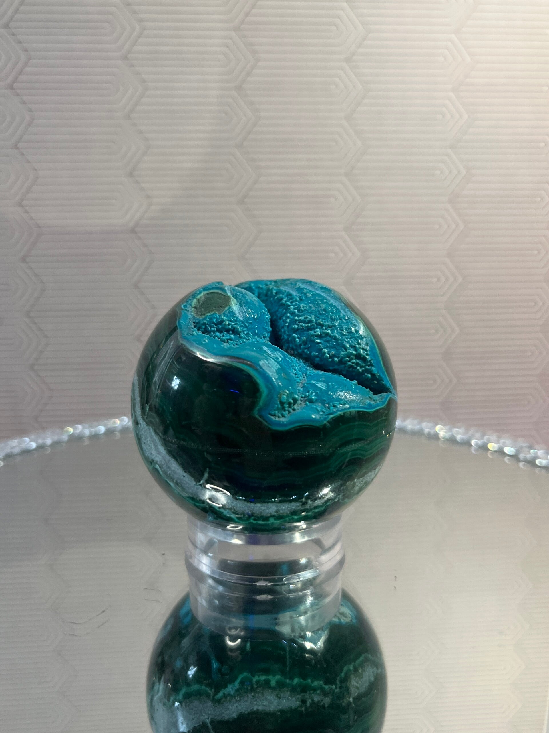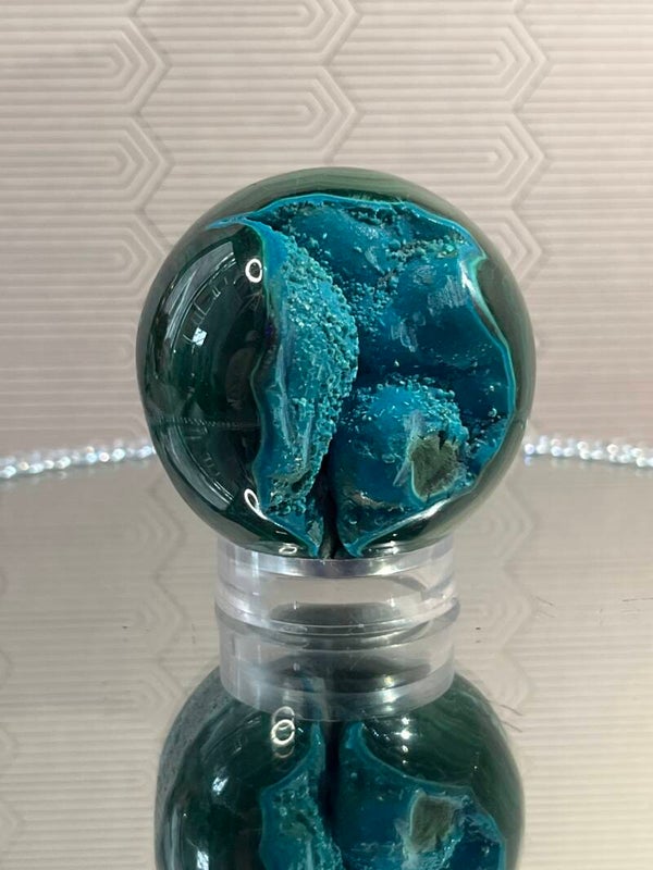 De combinatie van chrysocolla en malachiet werkt harmoniserend op hart- en keelchakra, brengt rust en emotioneel evenwicht, en versterkt de verbinding met intuïtie en zelfexpressie. De bolvorm verspreidt deze energieën gelijkmatig in de ruimte, wat zorgt voor een kalme, helende sfeer.