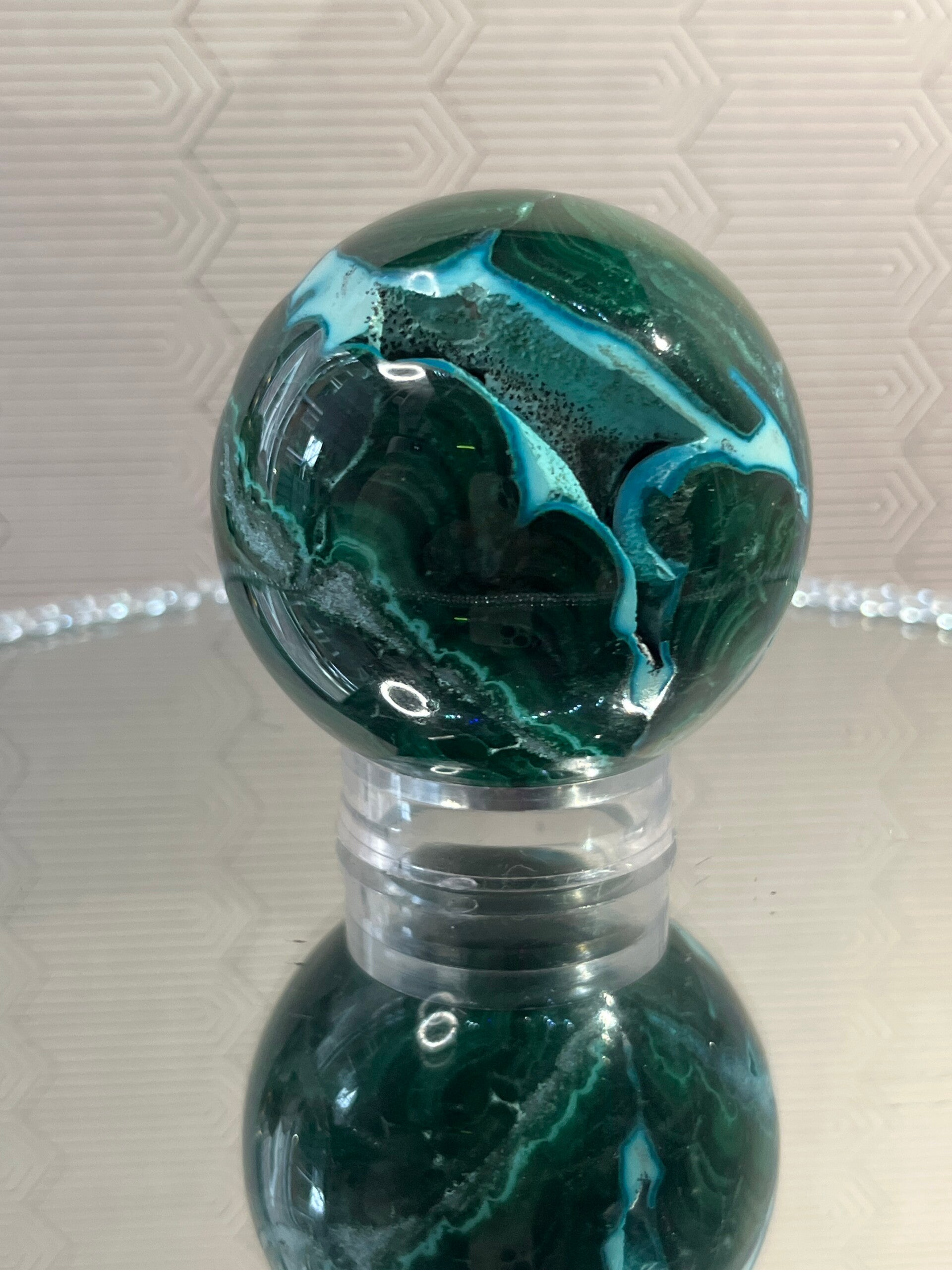Ontdek de kalmerende en helende energie van deze prachtige chrysocolla bol met malachiet. Perfect voor balans, emotionele rust en het versterken van je hart- en keelchakra. De bolvorm verspreidt harmonie en positieve energie in je ruimte, terwijl de natuurlijke kleuren en patronen een prachtig sieraad vormen voor elk interieur.